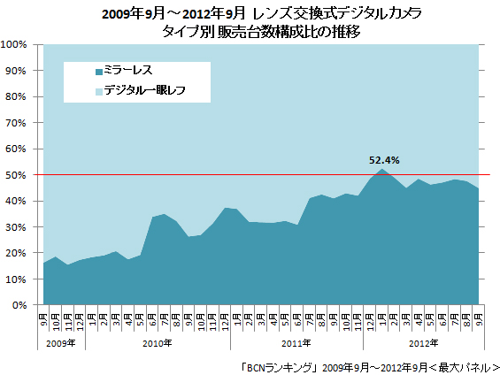 レンズ交換式デジタルカメラ全体の販売台数に占めるミラーレス一眼の割合も徐々に拡大していったが、2010年6月に初めて3割を超えた後、いったん20%台後半に低下した。しかし再び上昇に転じ、2011年7月に初めて4割を突破。2011年12月には48.6%まで上昇し、翌2012年1月は52.4%と、初めて5割を超えた。以降は40%台をキープしている。販売台数はずっと前年を上回っており、伸び率(販売台数前年比)はデジタル一眼レフを超える。
