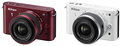 全6色のカラーを揃えるニコンの「Nikon 1 J2」(写真は、レッド、ホワイト)。2011年10月発売の第一弾モデル「Nikon 1 J1」は、シェア13.2%で2012年1~9月のミラーレス一眼カメラのシリーズ別販売台数1位だ