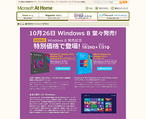 「Windows 8」の一般ユーザー向けラインアップは、「Windows 8」と、さまざまな機能を追加した「Windows 8 Pro」、Windows 8をWindows 8 Proにアップグレードする「Windows 8 Pro Pack」。旧OSのWindows 7/Vista/XPを使用しているユーザーは、家電量販店、オンラインショップ、日本マイクロソフトの「マイクロソフト ストア」が2013年1月31日までの期間限定で実施するキャンペーンで、パッケージ版が6090円(参考価格)で購入することができる。ダウンロード版は、マイクロソフトのウェブサイト「windows.com」で3300円。