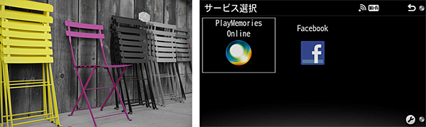 左は「ピクチャーエフェクト+」のパートカラーフィルターを使って2色だけを残してモノトーンにした写真。右は「ダイレクトアップロード」アプリの操作画面。Facebookへ簡単に写真をアップロードできる
