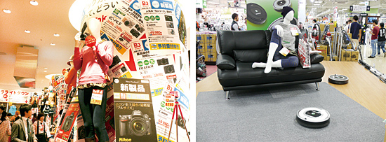 家電量販店やパソコン専門店は、自社の強みを生かした売り場やコーナーづくりにいそしんでいる。例えばビックロは、ビックカメラの扱う商品を手に持ち、ユニクロの商品を身にまとったマネキン「ビックロマネキン」を全フロアに設置。店内にある500体のマネキンのうち、80体がビックロマネキンだ。また、モニタに映った自分のからだにビックロのロゴがまとわりつく「ビックロモニター」で、来店者を楽しませている。「すばらしいゴチャゴチャ感」で、若者が多いJR新宿駅東口での存在感を確立し、「このモデルが成功すれば、ニューヨークやパリなど海外でも展開していきたい」(ユニクロの柳井正会長兼社長)として、新しいかたちの店舗づくりに取り組んでいる。