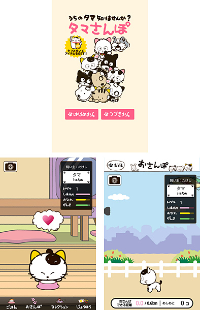 自分だけのタマを育ててお散歩する「ネコおでかけ」アプリ。ごはんをあげたり、GPSと連動して一緒に「おさんぽ」したり、予想外のハプニングに遭遇するなど、スマートフォンでタマを育てて楽しめる。Facebookで友だちとシェアすることもできる。