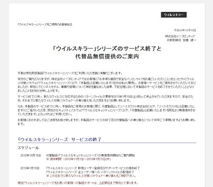 イーフロンティアは、2002年から販売していたウイルス対策ソフト「ウイルスキラー」シリーズに関するサポート業務と、新たなウイルスに対応するためのパターンファイルの提供(更新)を2013年1月19日をもって終了する。