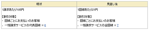 「ご利用料金のご案内」郵送の取りやめに伴い、「eビリング」割引の提供条件を見直す。割引額は、1請求あたり105円から、1回線あたり21円に変更。割引対象を一括請求サービスの代表回線から、一括請求サービスの全回線にする。