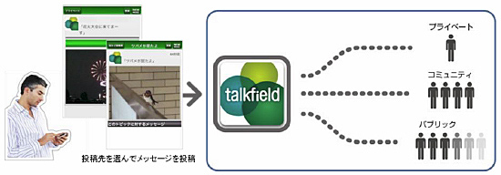 日立音声SNS「talkfield」は、スマートフォン専用アプリを通じて投稿した音声メッセージをユーザーが共有できるソーシャルサービス。気の合う仲間で作る「コミュニティ」、大切な人と語り合う「プライベート」、みんなに伝える「パブリック」の三つのフィールドを提供する。「~15秒にあふれる想いを込めて、声で伝えるSNS~」をコンセプトに日立が開発した。日立クラウドソリューション「Harmonious Cloud」のサービス提供拠点「Harmonious Cloudセンタ」から提供するSaaS(Software as a Service)型のサービスで、メディアや社会インフラ関連などの企業や公共分野など、幅広いユーザーのニーズに合わせて柔軟なシステム構成やサービス内容で提供できる。