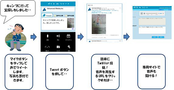 音声は最大30秒録音でき、録音音声をサーバーに保存して、後で聞き返したり検索したりできる。音声は「公開」「非公開」を選択でき、「公開」を選んだ場合はツイートに添付したURLで専用サイトに接続し、録音した音声を聞くことができる。