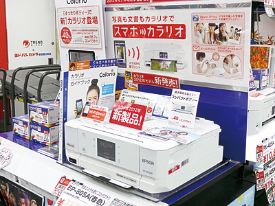 ヨドバシカメラ新宿西口本店では、スマートフォンと無線LAN環境でつないで画像を印刷するエプソンの「スマホカラリオ」を前面に出している。PCソフト・Mac専門チームの佐藤隆亮・マーケットイノベーターは、「インクジェット機を買い替えるお客様のほとんどが、スマートフォンの画像を印刷したいと考えている」と説明する。携帯電話やスマートフォンで撮影することがあたりまえになって、その画像をデータとして共有するだけでなく、次のステップとして「印刷」して共有するというニーズが生まれてきた。また、「今は、タッチパネルで簡単に操作できる機種がほとんど。デジタル機器に詳しくないお客様でも、抵抗なく購入していただける」という。さらに、「なかには文章だけを印刷したいというお客様もいて、高速印刷のモデルを提案するときもある」とのことだ。