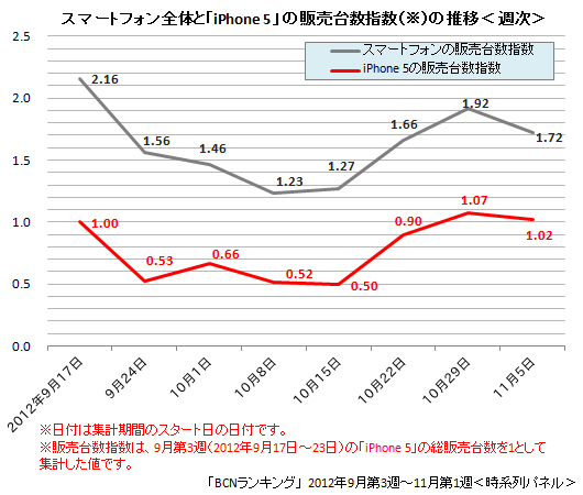 発売直後の9月第3週(2012年9月17~23日)の「iPhone 5」全体の販売台数を1として、週ごとの販売台数指数の動きをみると、発売2週目以降、いったんは0.5~0.6まで下がったものの、10月第4週(10月22~28日)は0.90、10月第5週(10月29日~11月4日)は1.07、翌11月第1週(11月5~11日)は1.02と、発売直後と同水準まで盛り返した。同じiOSを搭載した「第5世代iPod touch」や「iPad mini」のWi-Fiモデルなどの発売とともに、たまっていた予約分が一気に入荷したと推測される。iPadとiPhoneの間を埋める中間サイズとして、新たに発表された「iPad mini」との相乗効果もあるかもしれない。
