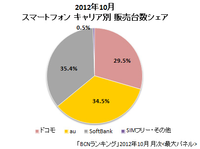 「iPhone 5」が大量に売れた結果、2012年10月は、携帯電話の事業者別契約数では三番手のソフトバンクモバイルが、35.4%を占め、スマートフォンのキャリア別販売台数シェア1位を獲得した。2位には、auがわずか0.9ポイント差で続いた。iPhoneを取り扱う2キャリアがほぼ同率1位で並んだといっていいだろう。ドコモは、キャリアの勢いを示す指標として参照される純増数やMNPによる転入・転出数だけではなく、10月に限ると、スマートフォンの月間総販売台数でも負けてしまった。