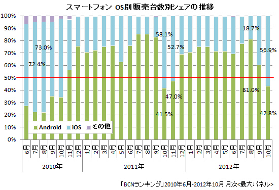 従来型携帯電話の販売が不振だったこともあり、携帯電話全体の月間販売台数に占めるスマートフォンの割合は8割近い78.7%に達し、過去最高値を更新した。また、スマートフォンに限った2012年10月のOS別販売台数シェアは、「iOS」が前月比17.5ポイント増の56.9%、「Android」が同17.3ポイント減の42.8%となり、2011年11月以来、久々に「iOS」が「Android」を上回った。しかし、1年前の2010年10月には16.5%あった「iOS」と「Android」のシェアの差は、今年10月は14.1%と、やや縮まっている。