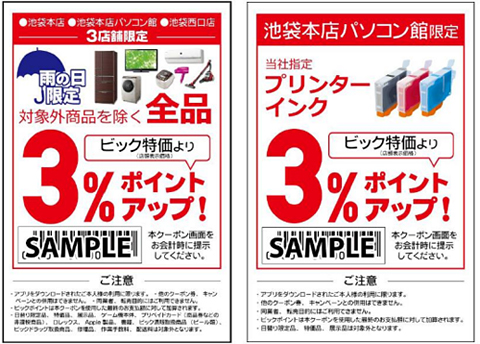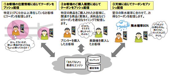 実験期間は、2012年11月19日~2013年1月31日。スマートフォン向けアプリ「ビック・スマートクーポン」を活用して、試験配信として、これまでの購入履歴や位置情報、天候などの状況に応じて最適なクーポンを最適なタイミングで配信する。期間中のクーポンを使用した場合、実証実験終了後に300ポイント分のビックポイントをプレゼントする。対象店舗は、池袋本店・池袋本店パソコン館・池袋西口店の3店舗で、対応機種はAndroid 2.3以上を搭載したスマートフォン。