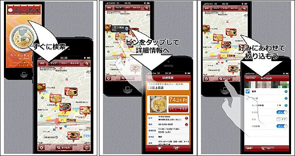 Agoop、iPhoneで最寄りのラーメン店を検索できるアプリ「ラーメンチェッカー」、周辺スポット検索サービスを活用