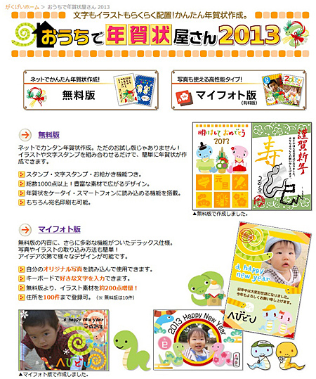 がくげいは、年賀状作成サイト「おうちで年賀状屋さん2013」をオープンした。サイト上で無料提供する「無料版」と、ソフトをダウンロード提供する「有料版(マイフォト版)」を用意する。