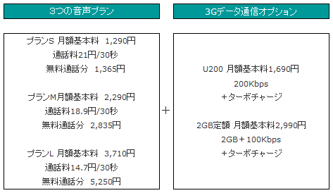 3Gデータ通信オプションは、通信速度が上り/下りともに200Kbpsで月額基本料1690円のプラン「U200」、または下り最大14Mbps/上り最大5.7Mbpsで月額基本料2990円の「2GB定額」の2種類。高速通信と低速通信をワンタッチで切り替えることができるデータ通信サービス「Turbo Charge」に対応する。