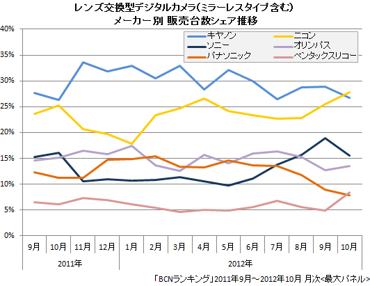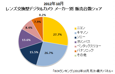 ニコンは、レンズ交換型デジタルカメラ(デジタル一眼カメラ)でもシェア27.7%で月間メーカー別販売台数1位を獲得し、一体型(コンパクト)と交換型(デジタル一眼)を合算したデジタルカメラ全体でも、シェア21.0%で1位に輝いた。いわゆる「ミラーレス一眼」と呼ばれ、従来のデジタル一眼レフカメラ、コンパクトカメラの間を埋める新ジャンルとして伸びているミラー構造のない小型・軽量のレンズ交換型デジタルカメラ(ミラーレス一眼カメラ)に限ると、シェア11.7%で5位にとどまったが、9月に発売した新製品「Nikon 1 J2」の価格がこなれてくれば、今年1~5月同様、再びトップ3入りするかもしれない。