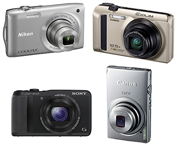 左上から時計回りに、ニコンのCOOLPIX S3300(クリスタルシルバー)、カシオのEXILIM EX-ZR300(ゴールド)、キヤノンのIXY 430F(シルバー)、ソニーのCyber-shot HX30V(ブラック)。下段の2機種は、Wi-Fiに対応する