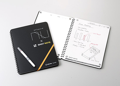 ホワイトボードをスケッチブック型のノートにして、いつでもどこでも持ち運んでメモできる。書いた内容をショットノートの専用アプリで撮影することで、アプリがボードの四隅のマーカーを読み取って台形補正や色補正、サイズ補正を自動で行い、データとしてスマートフォンの画面サイズぴったりに取り込む。