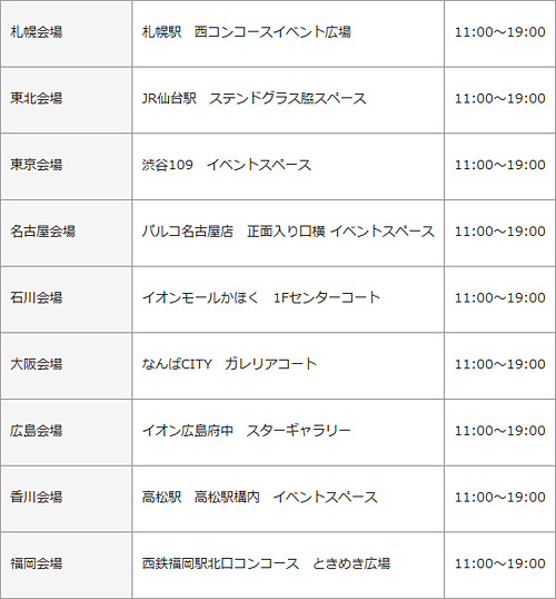 体験イベントは、札幌駅西コンコースイベント広場、JR仙台駅ステンドグラス脇スペース、渋谷109イベントスペース、パルコ名古屋店 面入り口横イベントスペース、イオンモールかほく1Fセンターコート、なんばCITYガレリアコート、イオン広島府中スターギャラリー、高松駅構内イベントスペース、西鉄福岡駅北口コンコースときめき広場の全国9会場で、11月30日~12月2日の3日間、11:00~19:00に実施する。