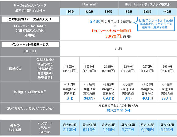 また、iPhone 5/4Sを含むauスマートフォンユーザーを対象に、スマートフォンとのセット利用でタブレットの基本使用料を980円割引く「スマホセット割」の提供と、データ通信量に応じてタブレットを基本使用料0円から利用できる「ゼロスタート定額キャンペーン」を実施する。なお、「ゼロスタート定額キャンペーン」利用時に適用される料金プラン「LTE ダブル定額 for Tab/Tab(i)」は、基本使用料とは別に月額490円の「au Wi-Fi SPOT 月額使用料」が必要。