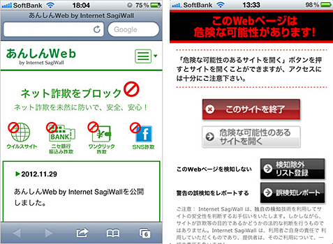 ソフトバンクグループのBBソフトサービスは、11月29日、iPhone用のフィッシング・ワンクリック詐欺対策機能を備えたウェブブラウザ「あんしんWeb by Internet SagiWall」の提供を、App Storeで開始した。2013年12月末まで無料で利用することができる。