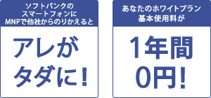 ソフトバンク3G携帯電話またはiPhone、SoftBankスマートフォンで2段階定額のパケット定額サービスに加入した場合は、ホワイトプラン基本使用料1年間無料(割引額の合計1万1760円)か、ソフトバンクポイント1万1760ポイントのどちらかを選べる。