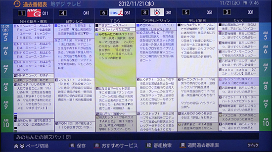 それでは「タイムシフトマシン」で録画した番組を視聴しよう。リモコンの「タイムシフトボタン」を押して「過去番組表」を表示する。ここから気になる番組を選んで録画番組を再生するのが、「タイムシフトマシン」の基本的な使い方だ。とはいえ、番組を一つひとつチェックして、見たい番組を探すのは大変だ。また、EPGに並んでいる番組のタイトルや番組情報の文字だけでは、興味のある番組や関心をもてそうな番組を見落としてしまうこともある。