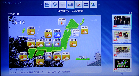 「ほかにもこんな番組」アイコンを選ぶと、視聴している放送中の番組や録画番組に近い内容の番組を画面右側にサムネイルで表示する。例えば、夕方のニュースを視聴していると同じ日の朝のニュース番組や前日のニュース番組がピックアップされた。あとはリモコンの上下ボタンで見たい番組を選んで、決定」を押すだけで、関連番組を視聴できる。「ほかにもこんな番組」機能を活用すれば、関連した番組を次々と視聴することができるのだ。