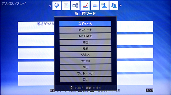 「ざんまいプレイ」は、いつも見ている番組を見逃さないだけではなく、あなたが興味をもっているかもしれない番組や、世間が注目している番組などをすばやく探すことができる。