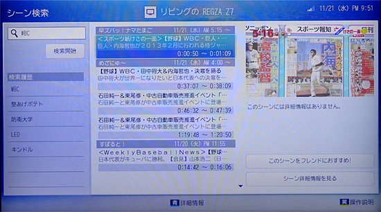 検索結果は、シーンのリストだけではなく、プレビュー画面も表示するので、自分が探していたシーンかどうか、すぐに見分けることができる。シーン検索機能を利用すれば、長い番組時間のなかから興味のあるシーンだけ拾い見することができるので、効率よく番組を視聴できる。