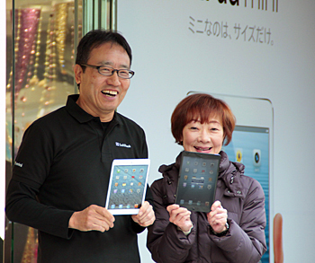 カウントダウンイベント後、オープンしたソフトバンク銀座に、列に並んでいた人たちが入店。先頭に並んでいた女性は、お目当てのiPad mini Wi-Fi + Cellularモデルを手に入れ、「これまでもiPadを使っていたが、持ち歩きづらかった。『iPad mini』なら持ち運びやすくて、LTEにも対応しているので、外に持ち出すのが楽しみ」と話した。女性に「iPad mini」を手渡した宮内副社長は、「バッグにもらくらく入る大きさで、女性から人気を集めるのではないか」と期待を込めてコメントした。