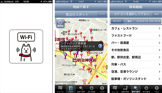 ソフトバンクモバイルは、12月3日、公衆無線LANサービス「ソフトバンクWi-Fiスポット」のアクセスポイント(Wi-Fiスポット)を手軽に検索できるiPhone/iPad向けアプリ「ソフトバンクWi-Fiスポット」をリリースした。