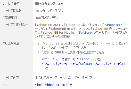 サービスの利用対象は、「Yahoo! BB ADSL」「Yahoo! BB ホワイトプラン」「Yahoo! BB バリュープラン」「Yahoo! BB 光 with フレッツ」「Yahoo! BB 光 フレッツコース」「Yahoo! BB for Mobile」「SoftBank ブロードバンド サービス」のいずれかのユーザー。「Yahoo! BB」または「SoftBank ブロードバンド サービス」の契約時にオプションサービスとして申し込むか、ソフトバンクBBのサービスサイトから追加で申し込みができる。