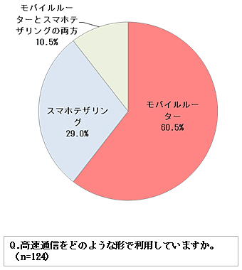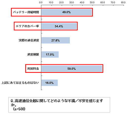一方、高速通信に対する不満・不安について聞いたところ、利用料金(59.0%)、バッテリ持続時間(49.0%)に続いて、エリアのカバー率が34.4%を占め、「あまりつながらないのでは」「対応しているエリアがまだまだせまいのでは」という不安を抱く人が多いことがわかった。スマートフォンのテザリングについては、利用料金(45.2%)、バッテリの持続時間(38.2%)に不満や不安を感じている人が多く、高速通信は、モバイルルータが60.5%、モバイルルータとスマートフォンの両方が10.5%、スマートフォンのテザリングが29.0%だった。
