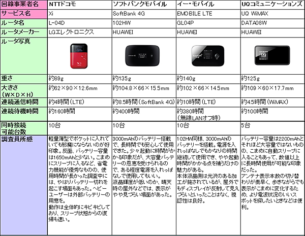 調査は11月9~15日の9:00~23:00に同条件で3回計測し、下りの通信速度の平均値を記録した。高速通信入否状況、電波本数に加えて、YouTubeで同一の動画を視聴した際の停止回数を記録。使用したルータは、NTTドコモのLGエレクトロニクス製「L-04D」、UQコミュニケーションズのHuawei製「DATA08W」、ソフトバンクモバイルのHuawei製「102HW」、イー・アクセス(イー・モバイル)のHuawei製「GL04P」。PCは、Core i5-2520Mを搭載する東芝「dynabook R731/B」を使用した。