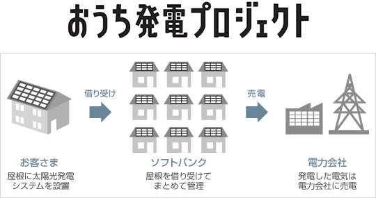 住宅の屋根をソフトバンクモバイルが借り受けて、「発電スポット」として太陽光発電システムを設置。SBエナジーがまとめて管理し、発電した電気をすべて電力会社に売電することで、太陽光発電の普及・拡大を図る新しい取り組み。太陽光発電システムは、20年の契約期間満了後、顧客に無償で譲渡する。