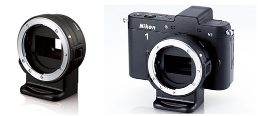左がマウントアダプタ「FT1」、右が「FT1」を装着したイメージ(カメラは「Nikon 1 V1」)