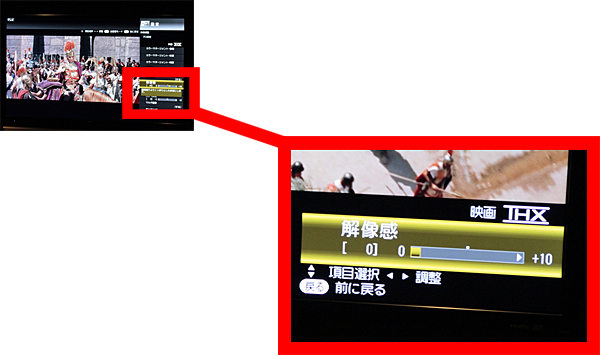 フルHD映像もより美しく再生する。最近のブルーレイディスク(BD)ソフトの一部では、上回るサイズでフィルムを読み取り、フルHDに圧縮している。こうしたフルHD以上の映像信号をもつ映像を解析し、より解像感の高い映像として映し出す。解像感は、映像作品や好みに合わせて調整できる。