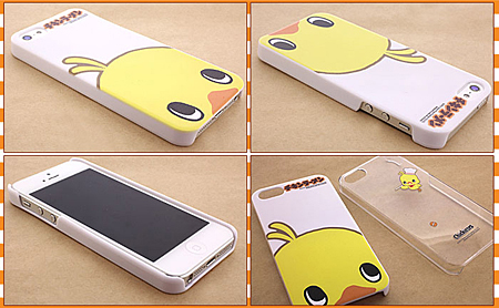 かわいらしいハードケース「ひよこちゃん/アップ」と、「iPhone 5」に装着すると、アップルマークと重なってデザインが完成するクリアハードケース「ひよこちゃん/コック」(右下の上)