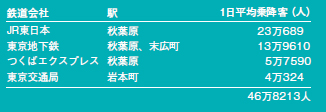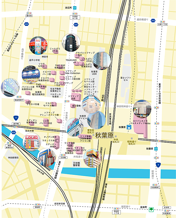秋葉原駅は、JRの山手線や京浜東北線、総武線、東京地下鉄(東京メトロ)の日比谷線、つくばエクスプレスが乗り入れている。街のなかには、東京地下鉄の末広町駅、東京交通局(都営地下鉄)の岩本町駅もあり、2011年の平均乗降客は、周辺の駅を含めると1日46万人を超える。