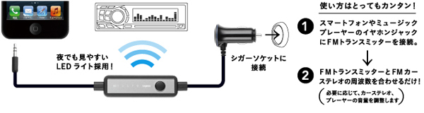 スマートフォンや携帯オーディオプレーヤーの3.5mmステレオミニプラグとシガーソケットをつないで、クルマで音楽が楽しめるFMトランスミッタ。DRC(ダイナミックレンジコントロール)機能で、走行中のノイズで消えてしまうような細かい音を車内でクリアに再現する。DRC機能は、オン/オフできる。