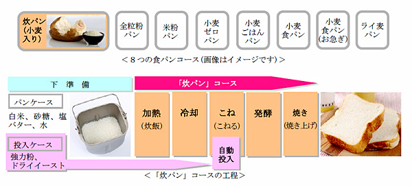 「炊パン」コースは、生米と材料を入れてスタートすると白米をおかゆ状に炊き、強力粉とドライイーストを自動投入してパンに焼き上げる。炊きたてのごはんをパンにするので、米デンプンの粘り気が強く、もちもちとした食感のパンが焼きあがる。また、白米を炊飯する際の酵素の働きによって還元糖の量も多く、甘みが引き立ち、米の油脂分の酸化が少ないパンになる。