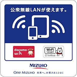 2013年1月から順次、一部の店舗を除く全国のみずほ銀行と、みずほコーポレート銀行の店内でNTTドコモのdocomo Wi-Fiと、ソフトバンクモバイルのソフトバンクWi-Fiスポットが利用できるようにする。公衆無線LANサービスに対応する店舗は、入り口のガラス面にそれぞれのロゴが入ったステッカーを貼付する。
