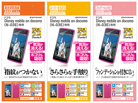 テレホンリースは、「ラスタバナナ」ブランドからNTTドコモのスマートフォン「Disney Mobile on docomo N-03E」専用アクセサリとして、液晶保護フィルムとカバー・ケースを12月中旬に発売する。
