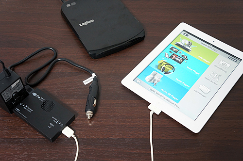 「LDR-PS8WU2BKW」には、クルマのシガーソケットから電源を供給できる車載用コンバータ「LPA-IVT100BK」が付属するモデルもある。長距離ドライブのときなどに、子どもにDVDビデオを見せることができて重宝する。もちろん、ワイヤレスで転送するので、ミニバンの3列目に座っていても、端末は目の前に置くことができる。また、USB端子があるので、スマートフォンやタブレットの充電も可能だ。