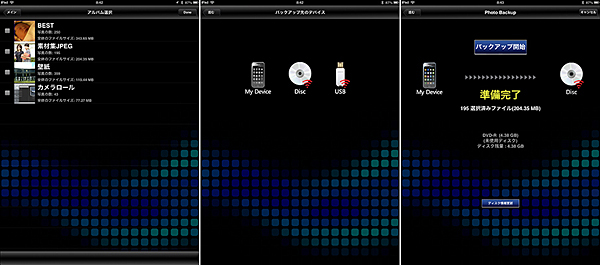Photo BackUp機能のステップ。左から、転送する写真を選んで、記録先メディアを選択。転送を実行する