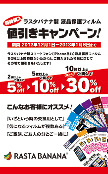 全国のビックカメラ・ソフマップの店舗で、「ラスタバナナ」のスマートフォン用液晶保護フィルムを2~4枚を同時購入すると5%、5~9枚を同時購入すると10%、10枚以上同時購入すると30%を割引きするキャンペーン。