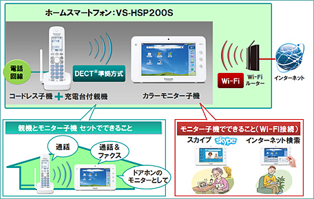 カラーモニタ子機には、Android 2.3を搭載。Wi-Fi環境があれば、SkypeなどのIP電話を用いたビデオ通話ができるほか、ブラウジング、Eメールの送受信など、インターネットを簡単に利用できる。Google Playから好きなアプリをダウンロードすることもできる。このほか、別売のパナソニック製のテレビドアホンと連携することで、来客の映像やセンサカメラ映像を、カラーモニタ子機の画面で確認できる。
