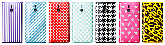 「ガラシール」装着イメージ(左から、ストライプ、ナナメストライプ、ドット、イチマツ、チドリ、スター、ヒョウガラ)