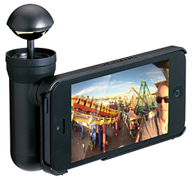 iPhone 5に取りつけて、専用アプリ「BubblePix」と組み合わせて使用することで、動画・静止画の360°パノラマ撮影を簡単に行うことができる。