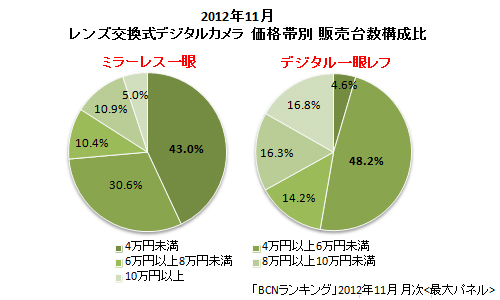 2012年11月のレンズ交換式デジタルカメラ全体の税別平均単価は6万5691円。税込みで7万円弱、ミラーレス一眼のレンズキットに限ると5万円台前半、デジタル一眼レフのレンズキットに限ると7万台前半だった。また、タイプごとの価格帯別構成比では、ミラーレス一眼は、平均以下の「4万円未満」が43.0%で最も多く、平均並みの「4万円以上6万円未満」と合わせると全体の約7割が「6万円未満」だった。一方、デジタル一眼レフは、「4万円以上6万円未満」が48.2%で最も多く、「4万円未満」と合わせると「6万円未満」が半数を占めるが、プロ向けモデルが該当する「10万円以上」も16.8%を占め、低価格帯一辺倒ではない。